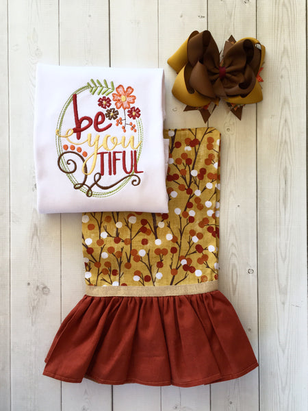 Girls, be-YOU-tiful this fall season. A fall outfit for girls designed with harvest gold, berry red, and copper fall colors. We offer limited "Rush Cut & Sew" slots if you need it sooner! Email us for more details. Quantities on this set are limited.